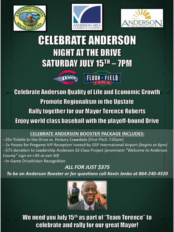 The Greenville Drive is hosting “Anderson Night” on Saturday, July 15. The entire night is being dedicated to all of Anderson County and what a great place it is to live, work and play. Also, with the hospitalization of Mayor Terence Roberts we want to show him how proud we are to have him as our mayor. The Anderson Area Chamber of Commerce will be selling t-shirts at cost for everyone to wear at the game. There are LIMITED QUANTITY for each size. Get them while they last! You can order t-shirts online at andersonscchamber.com. If you have any questions please do not hesitate to reach out at rdinkel@andersonscchamber.com.