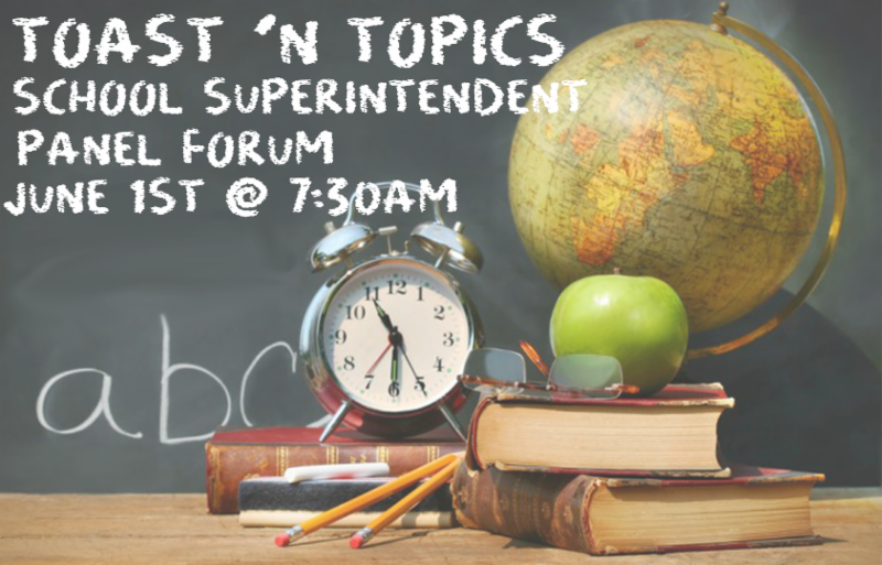 Join the Anderson Area Chamber of Commerce June 1st at 7:30am for this month's Toast 'N Topics - School Superintendent Forum Panel. Superintendents from all five Anderson County School Districts will inform on what their district is doing for its students.